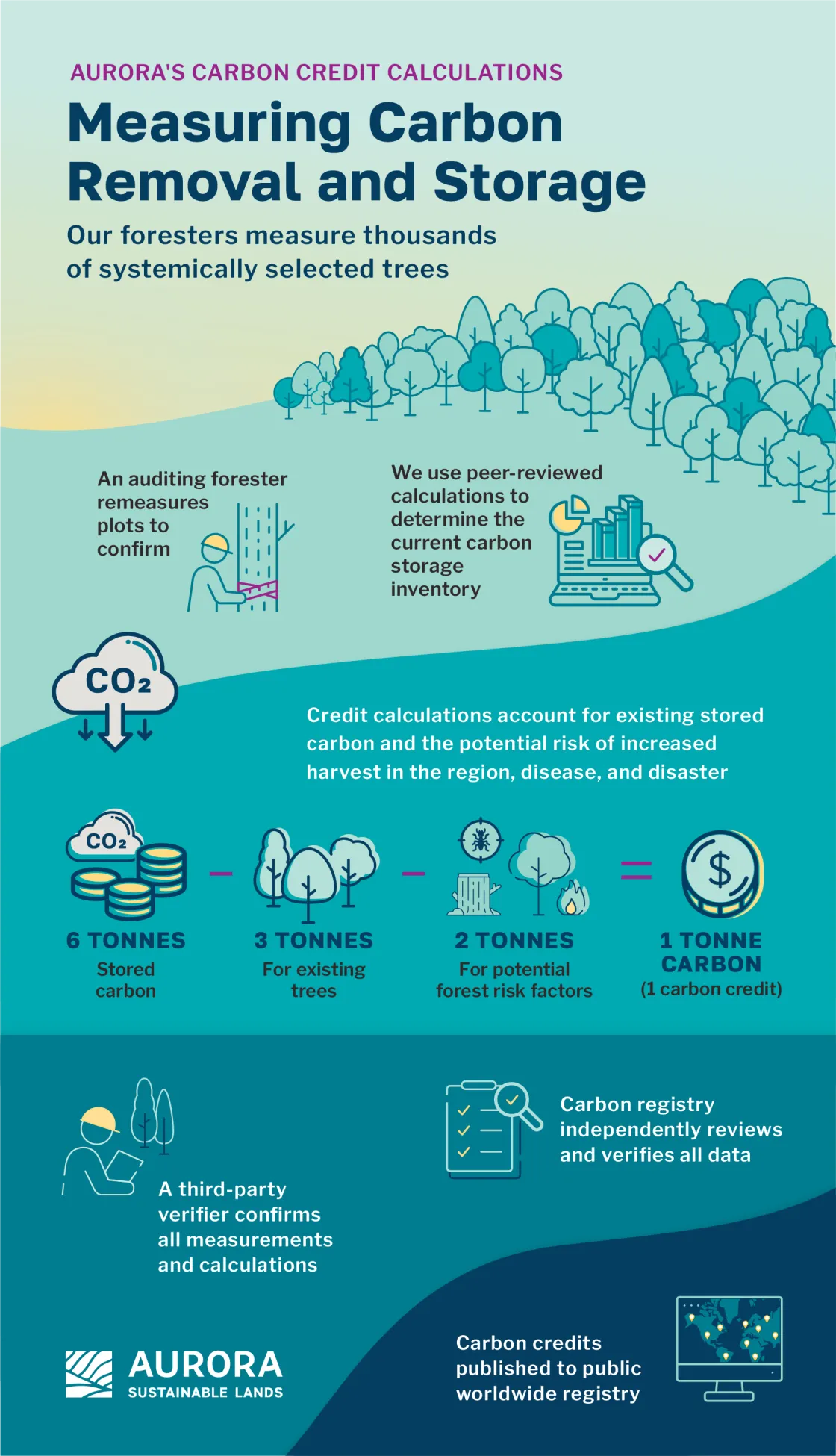 All measurements are confirmed by auditing foresters as part of project verification site visits. Our calculations are independently confirmed by third-party verifiers, then separately reviewed by the registry for accuracy.